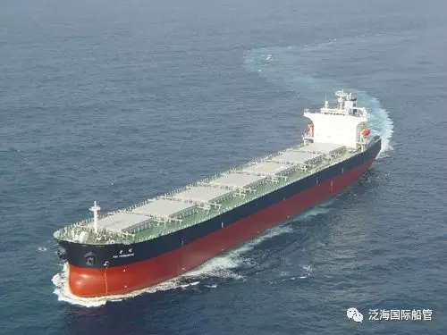 看,这是“台昇”轮在大海上的英姿。她总长225m,型宽32.26m,型深19.50m,配有7个货舱,总吨41378GT,载重吨77834,她也是泛海国际今年以来承接的第三艘船舶。